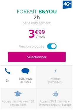 Pour les moins bavards, l’opérateur Bouygues Telecom vous propose un forfait B&YOU avec deux heures d'appels vers les fixes et les mobiles en France métropolitaine et vers les DOM (puis 0,20€/min au-delà en France métropolitaine). Vous bénéficiez avec cet abonnement du report des minutes non consommées. Autre avantage, les SMS/MMS sont illimités en France métropolitaine, et SMS sont aussi illimités vers les DOM. Et si vous avez peur de dépasser votre forfait, ce dernier existe en version bloquée au même prix à savoir 3.99€ par mois sans engagement de durée.