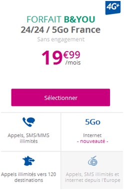 Forfait B&YOU 24/24 5Go à 19.99€ par mois :