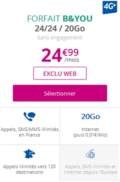 Forfait B&YOU 24/24 20Go à 24.99€ par mois (exclu web) :