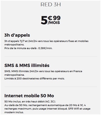 Pour les moins bavards, l’opérateur RED By SFR propose un forfait RED à 5.99€ par mois sans engagement de durée avec 3 heures d'appels 7j/7 et 24h/24 vers tous les opérateurs fixes et mobiles métropolitains (prix de la minute au-delà : 0,38€/min). Avec ce forfait, les SMS, MMS sont illimités 24h/24 vers tous les opérateurs en France métropolitaine. Pour la partie internet mobile, vous bénéficiez de 50 Mo inclus, en très haut débit (4G, 3G). Au-delà de 50 Mo, le rechargement est automatique de 20 Mo à 1€ (4 recharges maximum, puis usage internet bloqué). SFR Wifi et l’usage modem sont inclus dans ce forfait RED Mini.