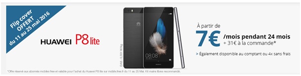 Entre le 11 et 25 Mai prochain, Free vous offre un flip Cover pour l'achat du Huawei P8 Lite au prix de 199€ à la commande en payant au comptant. Pour les plus petits budgets, Free Mobile vous propose le paiement en 24 fois sans frais en versant une première mensualité à la commande de 31€ puis 7€ par mois pendant 24 mois, ou encore en 4 fois sans frais avec un versement de 52€ lors de la commande puis 49€ pendant 3 mois.