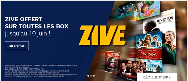 SFR offre jusqu'au 10 juin 2016 à tous ses abonnés TV son service Zive l'offre de vidéo à la demande pensée pour toute la famille . Cette offre vous permet d'accéder à des milliers de contenus pour toute la famille de façon illimitée 'blockbusters, films cultes et chefs-d'oeuvre sélectionnés par Studio Ciné Live, le meilleur des séries US et françaises, pour frisonner, rire et pleurer, partagez des moments merveilleux autour des films Disney ou des programmes ludo-éducatifs, visionner des programmes en 4K ULTRA HD, et vos films et séries en toute liberté, sur place ou à emporter avec le mode hors connexion '