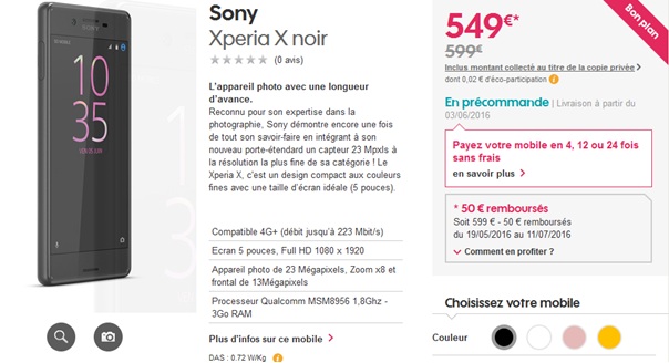 Le Sony Xperia X, le nouveau Smartphone orienté photo est en précommande chez Sosh au prix de 599€ avec un forfait Sosh à 4.99€ par ou encore à 9.99€ par mois. L'opérateur vous offre une remise différée de 50€ pour l'achat de ce nouveau mobile avec la souscription simultanée à un forfait illimité 5Go ou 10Go à partir de 19.99€ par mois et à condition de rester client minimum 2 mois, le Xperia X vous revient ainsi à 549€ au lieu de 599€. Entre le 20 mai 2016 et 02 juin 2016 inclus, profitez d'un casque Sony h.ear on d'une valeur de 179€ offert de la couleur de votre choix pour toute précommande d'un Sony Xperia X.