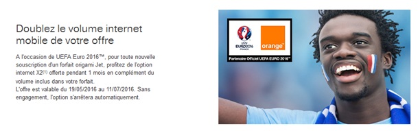Orange lance des nouvelles promotions spéciales Euro 2016 avec ses offres Origami Zen, Play ou Jet. En effet, à l'occasion de l'UEFA Euro 2016™, pour toute nouvelle souscription d'un forfait Origami Play ou encore Jet, Orange offre l'option internet X2 pendant 1 mois en complément du volume inclus dans votre forfait. Cette option sans engagement s'arrêtera automatiquement. Au-delà du premier mois offert, il est possible de conserver cette option Internet à 10€ par mois selon le forfait choisi.