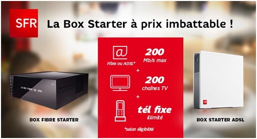 Tout comme l’offre Fibre, l’opérateur SFR vous propose son offre ADSL Box Starter à seulement 8.99€ par mois pendant 12 mois au lieu de 36.99€ par mois (engagement de 12 mois). La location de la box est facturée 3€ de plus par mois.