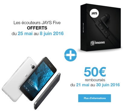 En ce moment avec Free Mobile, vous pouvez profiter d’un remboursement différé de 50€ sur le Microsoft Lumia 650 soit votre nouveau smartphone à 169€ au lieu de 219€. Cette offre de remboursement est valable jusqu’au 30 juin prochain. Pour en profiter, vous devez renvoyer le bulletin de participation avec les pièces justificatives demandées. Vous recevrez votre remboursement sous 10 à 12 semaines après réception de la demande complète. Autre bon plan disponible jusqu’au 8 juin prochain, vous pouvez recevoir en cadeau des écouteurs Jays Five d’une valeur de 89€.