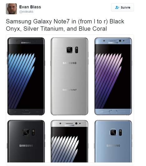 Evan Blass, le journaliste toujours bien renseigné a publié ce Week-end, des photos de presse du prochain Galaxy Note 7 sur son compte Twitter et révèle ainsi son futur design. Cette nouvelle phablette qui fait parler d'elle ces dernières semaines apparaît en trois coloris Noir Onyx, ou encore Argent Titane et bleu Corail. Ces images viennent également confirmer les précédentes rumeurs qui indiquaient un design proche du Galaxy S7 Edge avec un écran courbé ainsi que la présence d'un capteur biométrique.