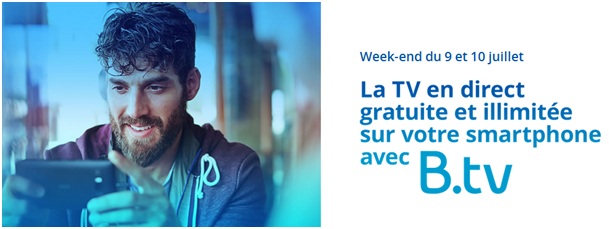 Le week-end prochain, l’opérateur Bouygues Telecom propose la TV en direct gratuite et illimitée sur votre smartphone avec B.tv. Ce cadeau est réservé aux clients existants, pour en profiter, il vous suffit de télécharger l'application B.Tv sur votre smartphone puis éteindre et rallumer votre smartphone. Cette offre est valable du 09 au 10 juillet 2016 en France métropolitaine avec un équipement compatible.