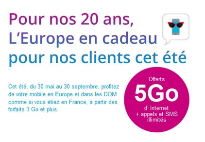 Si vous n’êtes pas encore client, vous pouvez aussi en profiter ! Il vous suffit de souscrire à un forfait de 5Go et plus, et activer votre cadeau Europe avant le 30 août pour en profiter 31 jours. Pour les clients existants (forfait de 3Go et plus), vous pouvez profiter de ce cadeau jusqu’au 30 septembre. Pour l’activer rien de plus simple, il vous suffit de répondre au SMS que vous recevrez en arrivant dans le pays visité ou rendez-vous dans votre espace client.