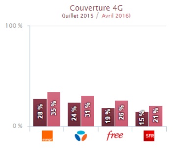 Autre point constaté grâce à cette enquête, les résultats montrent que les opérateurs poursuivent le déploiement de la 4G. Entre le 1er juillet 2015 et le 1er avril 2016, chaque opérateur a augmenté sa couverture 4G d'environ 7% du territoire. Cette augmentation de couverture est le résultat des investissements des opérateurs, qui ont, en 9 mois, équipé plus de 6 000 antennes en 4G. En revanche, le déploiement, en particulier en zone rurale, doit se poursuivre, afin de réduire l'écart entre la zone rurale et la zone dense.
