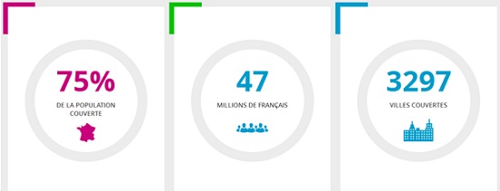Récompensé à plusieurs reprises pour son expérience 4G de qualité, en particulier pour l'étendue de la couverture 4G et pour la fluidité des débits avec la 4G+. Cet opérateur couvre 75% aujourd’hui de la population soit 47 millions de français couverts par le réseau 4G de Bouygues Telecom avec 3297 villes couvertes.