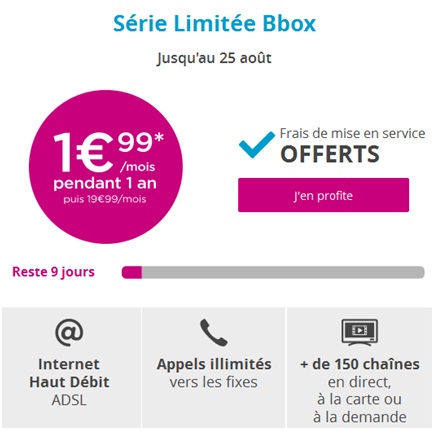 L’opérateur Bouygues Telecom propose depuis quelques minutes une nouvelle offre promotionnelle à couper le souffle ! En effet, Bouygues Telecom propose une Série Limitée Bbox jusqu’au 25 août prochain à seulement 1.99€ par mois pendant 12 mois puis 19.99€ par mois. De plus, Bouygues Telecom vous offre également les frais de mise en services. La location de la Box est facturée tous les mois 3€. Cette Série Limitée Bbox est soumise à un engagement de 24 mois.