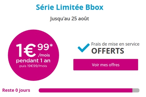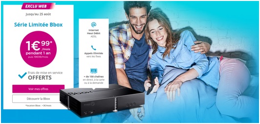 Vous avez jusqu’à ce soir pour profiter de la Série Limitée Bbox de l’opérateur Bouygues Telecom proposée à seulement 1.99€ par mois pendant 12 mois puis 19.99€ par mois. Et en bonus, les frais de mise en service sont offerts au lieu de 59€ habituellement. Cette offre Bbox est soumise un engagement de 24 mois et la location de la box est facturée 3€ de plus par mois soit votre abonnement mensuel à 4.99€ par mois.