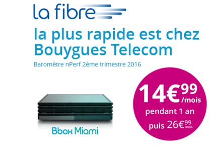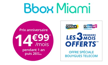 L’opérateur Bouygues Telecom vous propose de passer à la vitesse supérieure grâce à l’offre Bbox Miami disponible à seulement 14.99€ par mois pendant un an puis 26.99€ par mois (hors coût de location de box à 3€/mois). Attention, cette offre promotionnelle s’arrête le 23 octobre prochain. Et pour toute souscription avant le 23 octobre prochain, vous pouvez aussi profiter de l’offre spéciale Bouygues Telecom avec les 3 premiers mois offerts aux chaînes Canal+ et CanalSat Panorama.