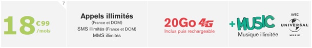 Ce forfait vous permet aussi d’appeler en illimité vers les fixes et mobiles en France et DOM (dans la limite de 129 destinataires par mois et 3 heures maximum par appel). Ce forfait La Poste intègre aussi les SMS illimités vers la France et les DOM ainsi que les MMS illimités vers la France. En bonus, vous bénéficiez aussi de la musique illimitée avec le service d’écoute à la demande Universal Music.