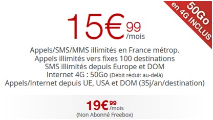 Chez l’opérateur Free Mobile, vous pouvez choisir le forfait Free illimité facturé tous les mois 19.99€ ou 15.99€ pour les abonnés Freebox. Avec ce forfait, vous profitez d’une enveloppe data de 50Go en 4G valable sur le réseau et avec mobile 4G (dans la limite de 20 Go en 3G avec mobile 4G). Avec mobile non compatible 4G, ce forfait intègre jusqu’à 3 Go par mois en 3G.