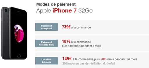 Pour info, SFR propose depuis le 15 septembre, un service de location, l'iPhone 7 et 7 Plus figurent dans la liste des modèles disponibles à la location. L’iPhone 7 est proposé à 0€ à la commande avec un loyer mensuel de 25€ pendant 24 mois par exemple chez SFR avec un forfait Power 20Go à 25.99€ par mois la première année puis 35.99€ par mois.