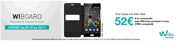 Jusqu’au 10 novembre prochain, vous pouvez profiter d’un Folio Wiboard offert pour l’achat d’un Wiko Ufeel avec un forfait sans engagement Free Mobile. Ce smartphone est commercialisé chez Free Mobile à 199€ au comptant ou 52€ à la commande puis 49€ par mois pendant 3 mois.
