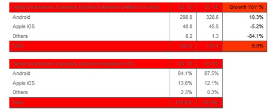 Au 3ème trimestre 2016, les ventes de mobiles représentent 375.4 millions de smartphones dans le monde dont 328.6 unités sous Android, 45.5 millions d'iPhone et 1.3 millions pour les autres OS du marché. On constate une progression de 6% pour la vente de terminaux par rapport à la même période l’année précédente (avec 354.2 millions d'unités vendues).