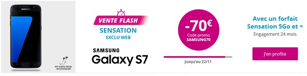 -199.90€ au lieu de 269.90€ avec le code promo SAMSUNG70 puis 8€ par mois 24 fois avec le forfait Sensation 5Go à 34.99€ par mois, ou encore à 391.90€ au liue de 461.90€ en le payant au comptant, avec l'opération Joyeux TECHNOEL, le Galaxy S7 est proposé à partir de 241.90€,