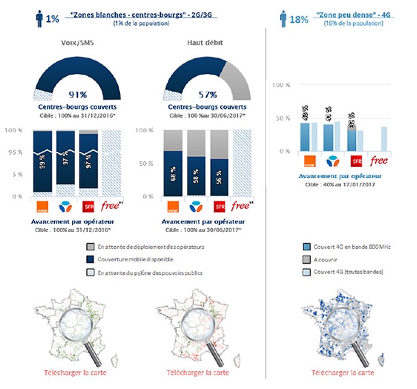 Dans ce point, l'ARCEP dresse un bilan plutôt positif avec des déploiements qui avancent mais qui doivent tout de même s’accélérer afin d'être finalisés d’ici le 30 juin 2017. Rappelons que le programme gouvernemental « Zones blanches - centres-bourgs » va permettre d’apporter une couverture de base dans un certain nombre de centre-bourgs qui n’avaient aucune couverture. Ce programme lancé en 2003 comprend près de 3800 centres-bourgs, ce qui représente 1% de la population.