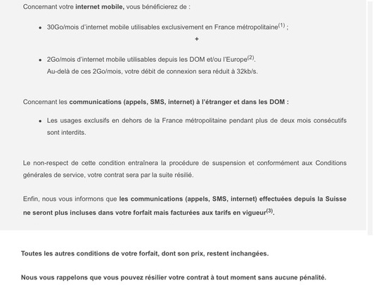 Un autre changement annoncé concerne cette fois les communications depuis la Suisse, qui ne fera plus partie de la liste des pays compris dans le roaming des offres Bouygues Telecom.