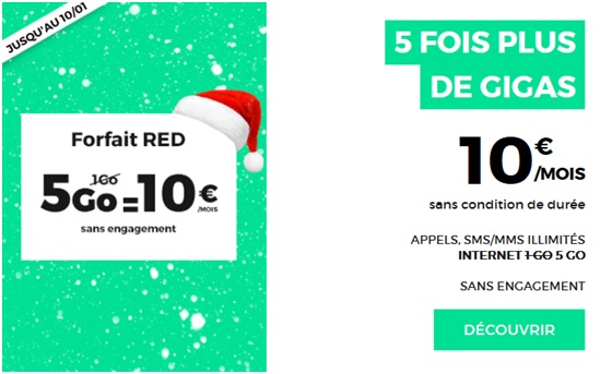 Pour bien débuter l’année, l’opérateur RED by SFR vous propose un forfait illimité 5Go facturé seulement 10€ par mois sans condition de durée c'est-à-dire à vie. Ce forfait est disponible jusqu’au 10 janvier inclus. Pour rentrer un peu plus dans les détails, il s’agit d’un forfait sans engagement de durée avec les appels illimités vers tous les mobiles et fixes en France métropolitaine et DOM (hors Mayotte). De plus, les SMS et MMS sont illimités 24h/24 vers tous les opérateurs en France métropolitaine.