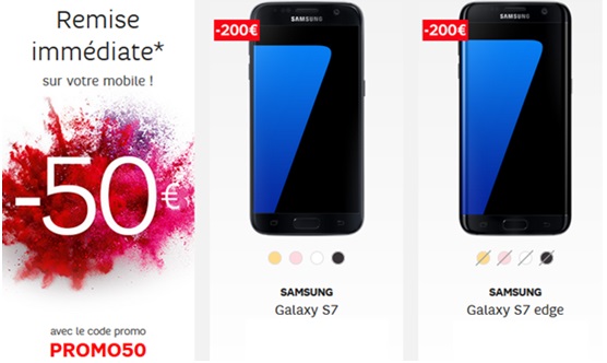 SFR prolonge aussi la réduction de 50€ pour l’achat d’un Smartphone avec les offres Starter 24/24 + 1Go, Power et Premium avec engagement de 24 mois (hors iPhone 7 et 7Plus).