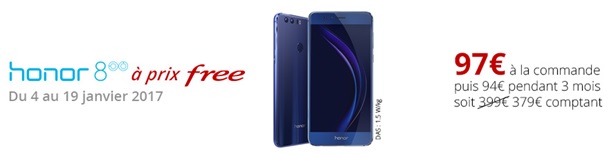 Depuis aujourd’hui, l’opérateur Free Mobile vous propose le smartphone Honor 8 à 379€ au comptant au lieu de 399€ ou 97€ à la commande puis 94€ pendant 3 mois. Cette offre promotionnelle est disponible jusqu’au 19 janvier prochain. Profitez-en !