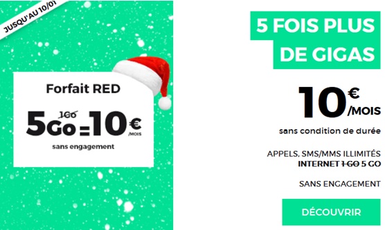 Profitez du week-end pour changer d’opérateur et ainsi profiter des offres promotionnelles de l’opérateur RED by SFR. Pour la partie forfait mobile, vous pouvez jusqu’au 10 janvier inclus souscrire à un forfait RED 5Go pour seulement 10€ par mois sans condition de durée c'est-à-dire que ce tarif est valable à vie.