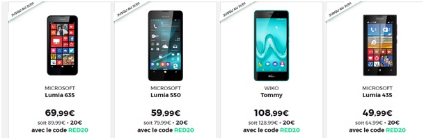 L’opérateur RED by SFR vous propose 20€ de réduction sur votre nouveau mobile à petit prix. Avec le code promo RED20, vous profitez en effet d'une remise immédiate sur les modèles Lumia 635, Lumia 550, Lumia 445 et le Wiko Tommy jusqu'au 31 janvier 2017.