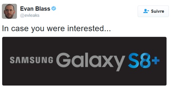 Le célèbre journaliste américain Evan Blass est à l’origine de nombreuses rumeurs autour du Galaxy S8, il vient une nouvelle fois via son compte Twitter confirmer la présence d’un modèle S8 + avec la publication du logo de l'appareil ci-dessous où il apparaît la mention ‘samsung Galaxy S8+’ .