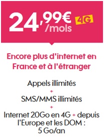 Sosh, la marque digitale de l’opérateur Orange commercialise une gamme de 4 forfaits sans engagement de durée avec un forfait illimité 20Go facturé 24.99€ par mois.