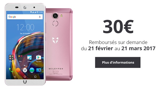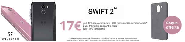 L’opérateur Free Mobile commercialise désormais le nouveau smartphone Wileyfox Swift 2 en rose et jusqu’au 21 mars inclus, vous pouvez profiter d’un remboursement différé de 30€ sur demande soit ce nouveau mobile à 149€ au lieu de 179€ au comptant. Free Mobile vous propose également de payer en plusieurs sans frais soit 47€ à la commande (17€ après remboursement) puis 44€ par mois pendant 3 mois. Pour recevoir votre remboursement de 30€, vous devez renvoyer le bulletin de participation accompagné des pièces justificatives demandées.