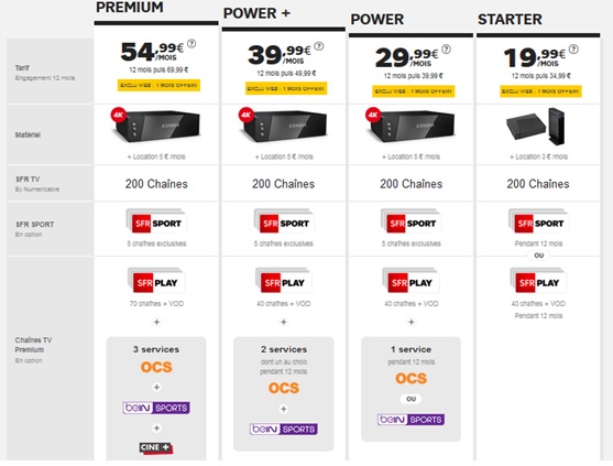 - L'offre BOX THD OU HD Premium avec SFR Sports, SFR Play (70 chaines + VOD), et 3 services OCS, beIN Sports et Cine + est en promo à 54.99€ par mois puis 69.99€ par mois. (la box est en location à 5€ par mois)