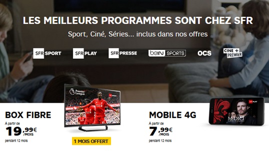 Pour les amateurs de Sports, SFR vous propose d'accéder gratuitement à vos sports préférés avec les 5 chaînes exclusives du bouquet SFR Sports avec toutes les offres du catalogue. beIN Sport est également offert pendant un an avec les offres Power + et Premium. Pour un programme TV pour toute la famille, SFR propose aussi le bouquet SFR Play au choix ou inclus avec 40 chaînes ou 70 chaînes incluses selon l'offre ainsi que la VOD illimitée. OCS est également offert la première année avec les offres Power et Plus. Pour la formule Premium, profitez d'un max de contenus TV avec le service SFR Play 70 chaînes ainsi que 3 services offerts avec OCS, beIN Sports et Cine+.
