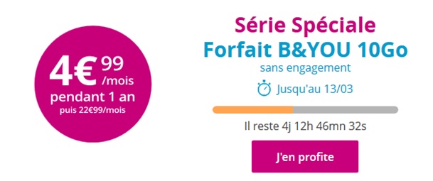 L’opérateur Bouygues Telecom a débuté très fort la semaine en lançant en exclusivité web une Série Spéciale B&YOU 10Go sans engagement à seulement 4.99€ par mois pendant une période de 12 mois puis 22.99€ par mois. Cette offre est disponible jusqu’au 13 mars inclus sur le site de l’opérateur Bouygues Telecom.