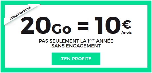 L'opérateur RED by SFR vient aujourd’hui de riposter en boostant son forfait illimité avec 20 fois plus de gigas. Concrètement, vous pouvez jusqu’au 23 mars prochain souscrire à un forfait RED 20Go à 10€ par mois et pas seulement la première année mais pendant toute la durée de votre contrat (à vie).