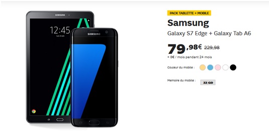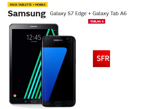 -Le Samsung Galaxy S7 Edge est proposé au prix de 1€ au lieu de 101€ avec une remise différée de 100€ par SFR et le paiement en 24 fois sans frais avec le forfait Power 50Go en promo à partir de 47.99€ au lieu de 57.99€. La Galaxy Tab A6 est disponible au prix de 49.99€. Votre pack tablette et smartphone vous revient ainsi à 50.99€ au lieu de 150.99€ en payant chaque mois 55.99€ pendant 1 an puis 65.99€.