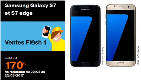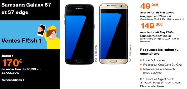 Orange vous offre une remise immédiate de 100€ pour l’achat d'un Galaxy S7 ou S7 Edge jusqu'au mercredi 22 mars 23h59 en exclusivité Web pour toute souscription à un forfait Origami Play avec engagement de 24 mois. Bénéficiez également d'une réduction de 10€ par mois pendant 1 an sur votre forfait Orange Origami Play avec portabilité de numéro et ce jusqu’au 05 Avril 2017.