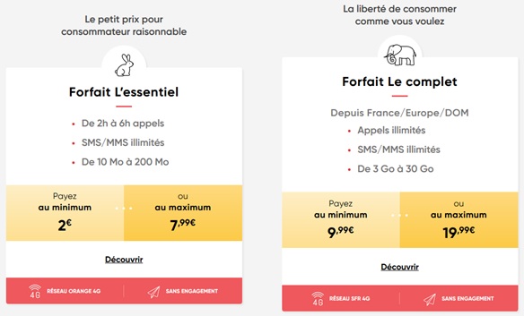 La nouvelle gamme de l’opérateur Prixtel regroupe de deux forfaits sans engagement : L’essentiel et Le complet. Cet opérateur reste toujours sur le principe d’un forfait ajustable qui s’adapte à votre consommation mensuelle pour vous faire bénéficier du meilleur tarif chaque mois. Concrètement, ces deux forfaits ont un prix minimum et maximum et varient en fonction de l’usage Voix et Internet Mobile du consommateur. Autre info, les offres Prixtel sont garanties sans hors forfait, l’utilisateur bénéficie du meilleur tarif chaque mois avec l’assurance de ne jamais dépasser 7,99€ pour L’essentiel et 19,99€ pour Le complet.