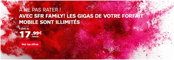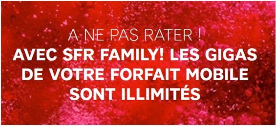 SFR FAMiLY est la première offre famille à partager, l’opérateur au carré rouge à la conquête de nouveaux abonnés souhaite fidéliser tous les membres d'une même famille. Ce service dédié à toute la famille lancé ce service en Avril 2016, permet de profiter de nombreux avantages. En regroupant votre ligne fixe et mobile de la famille, le titulaire de la ligne principale Power ou Power + profite depuis ce vendredi 24 mars de la data illimitée et partage jusqu’à 100Go d’internet 3G ou 4G avec ses proches équipés d’une ligne starter 2h ou 24/24.