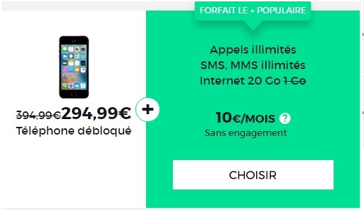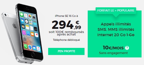Le bon plan proposé par RED BY SFR pour l'achat d'un iPhone SE 16Go est prolongé. Vous avez jusqu'au 03 avril prochain pour profiter de la remise différée de 100€ sur ce modèle d'Apple. L'iPhone SE 16Go vous revient à 294.99€ au lieu de 394.99€ depuis le 14 mars dernier. Le modèle 64Go est aussi en promo au prix de 359.99€ au lieu de 459.99€. Pour accompagner l'achat de votre nouveau Smartphone, RED propose une gamme de forfaits sans engagement à partir de 5€ par mois. Et jusqu'au 03 avril prochain, vous pouvez profiter d'une édition spéciale RED BY SFR avec 20Go de data à seulement 10€ par mois à VIE. Cette offre promotionnelle est idéale pour profiter des fonctionnalités de votre nouveau Smartphone et surfer sans compter.
