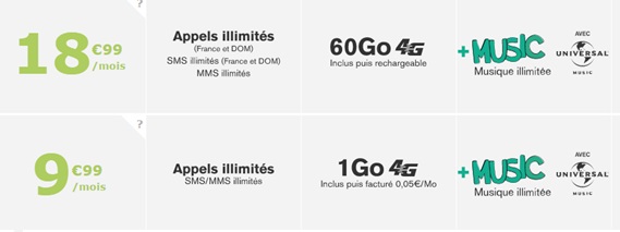 Ce forfait sans engagement comprend 2 heures de communication par mois en France ainsi que SMS et MMS illimités. Pour la partie internet sur mobile, vous disposez d’une enveloppe data de 2Go par mois en 4G (rechargeable). Vous bénéficiez aussi d’un accès en illimité au service d’écoute de musique à la demande Universal Music (décompté de votre enveloppe data). Si vous utilisez en cours de mois l’intégralité de votre forfait Internet, vous ne pourrez plus accéder au service de musique à la demande en mode connexion, toutefois vous pouvez continuer à accéder au service en mode wi-fi, et aux titres que vous aurez préalablement chargés en mode hors connexion.