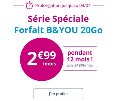 Pour votre forfait mobile, cet opérateur brade actuellement son forfait B&YOU 20Go (sans engagement) à seulement 2.99€ par mois pendant 12 mois au lieu 24.99€ par mois. Ce forfait disponible en Série Spéciale comprend les appels illimités vers les mobiles et fixes de France métropolitaine et DOM. De plus, les SMS et MMS sont illimités en France métropolitaine ainsi que les SMS illimités vers les DOM.