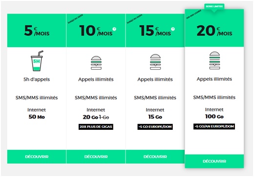 Si vous avez besoin de changer de forfait mobile RED By SFR propose une gamme de forfaits sans engagement à partir de 5€ par mois avec 5h d'appels par mois et 50Mo. Pour les plus bavards, les offres avec appels illimités démarrent à 10€ par mois avec 1Go de data ou encore pour les plus ultra-connectés 15Go de data à 15€ par mois ou encore 100Go à 20€ par mois. Les prix sont valables à VIE.