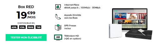 RED BY SFR vous propose l'offre la moins chère du marché pour profiter d'un accès Internet rapide pour la maison sans promo. De plus, la RED BOX est sans engagement et sans frais de location pour le matériel. Facturé 19.99€ par mois sans condition de durée, la RED Box vous permet de profiter d’un accès Haut Débit ou Très Haut Débit jusqu’à 100 Mb/s selon votre éligibilité ainsi que le téléphone illimité avec les appels illimités vers les fixes en France et vers plus de 100 destinations. Pour la TV, une option à 2€ par mois est proposée lors de la souscription.