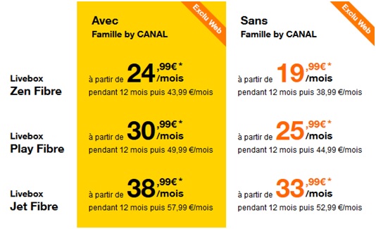 Si vous optez pour l’offre Livebox Play Fibre, cette dernière est facturée avec Famille by Canal 30.99€ par mois pendant 12 mois au lieu de 49.99€ par mois. Sans ce bouquet TV, l’offre Livebox Play Fibre est à 25.99€ par mois pendant 12 mois au lieu de 44.99€. Autre offre disponible, la formule Livebox Jet Fibre avec Famille by Canal est à 38.99€ par mois pendant 12 mois au lieu de 57.99€ ou 33.99€ par mois pendant 12 mois sans ce bouquet Canal au lieu de 52.99€. Les offres Livebox Orange sont disponibles sans engagement. La location de la Livebox est facturée 3€ de plus par mois.