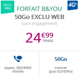 L’opérateur Bouygues Telecom commercialise un forfait B&YOU 50Go à 24.99€ par mois. Ce forfait sans engagement se compose des appels illimités vers les mobiles et fixes de France métropolitaine et DOM, les SMS/MMS illimités en France métropolitaine ainsi que les SMS illimités vers les DOM.