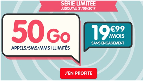 La Série Limitée 50Go au prix de 19.99€ par mois sans condition de durée et sans engagement comprend les appels illimités vers les fixes et mobiles en France métropolitaine, dans la limite de 129 correspondants différents maximum par mois et de 3 heures maximum par appel. Vous bénéficiez aussi des SMS et MMS illimités en France. Pour la partie internet sur mobile, cette offre embarque un volume de 50Go par mois jusqu'en 4G avec une réduction de débit au-delà du volume autorisé. Les services inclus sont la présentation du numéro, la portabilité du N° (sur demande), le Mode modem et la Voix sur IP.